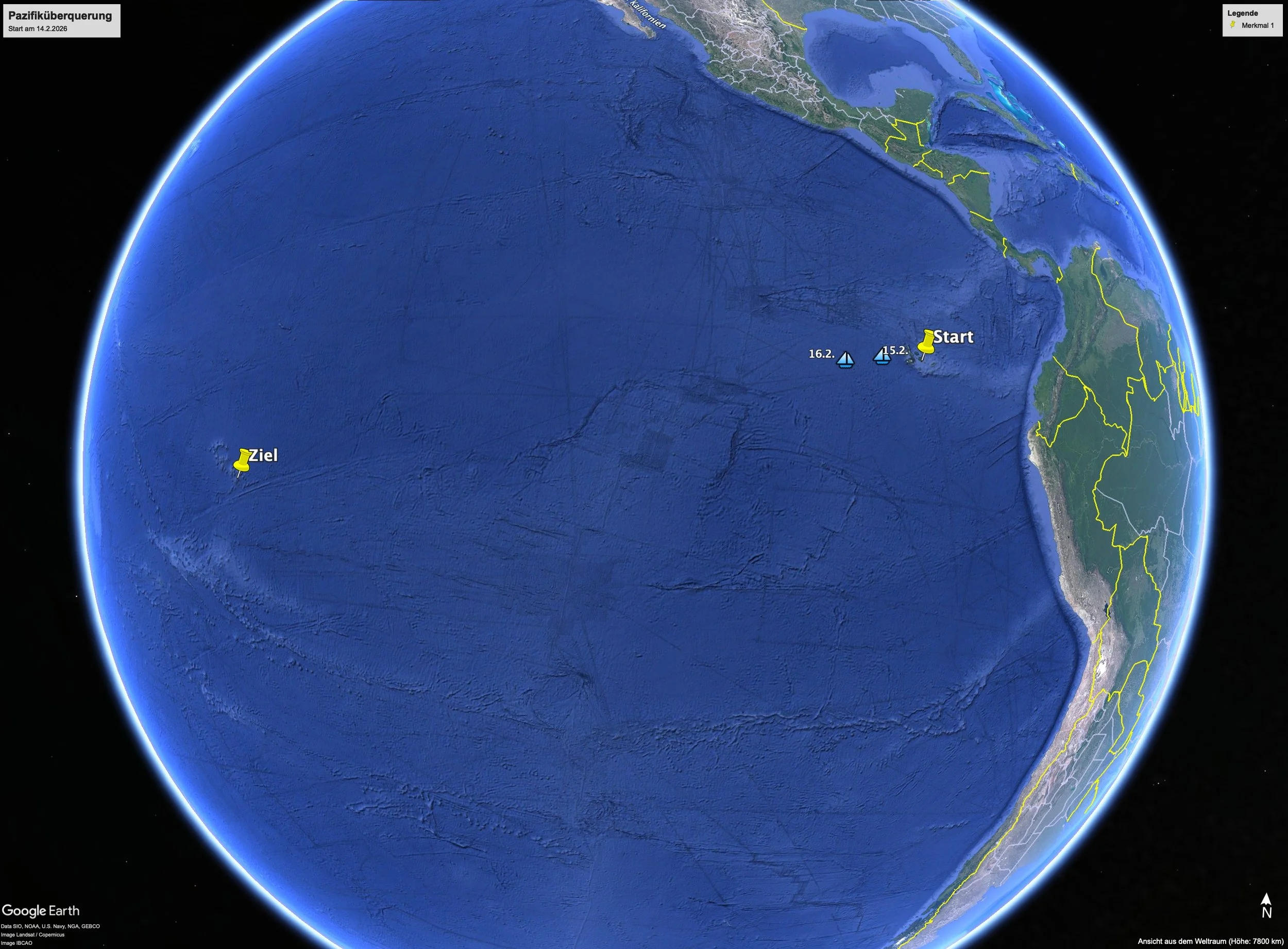 Startposition 15.02.26, 18:25 Uhr: 1°32′17″ S 93°9′46″ W