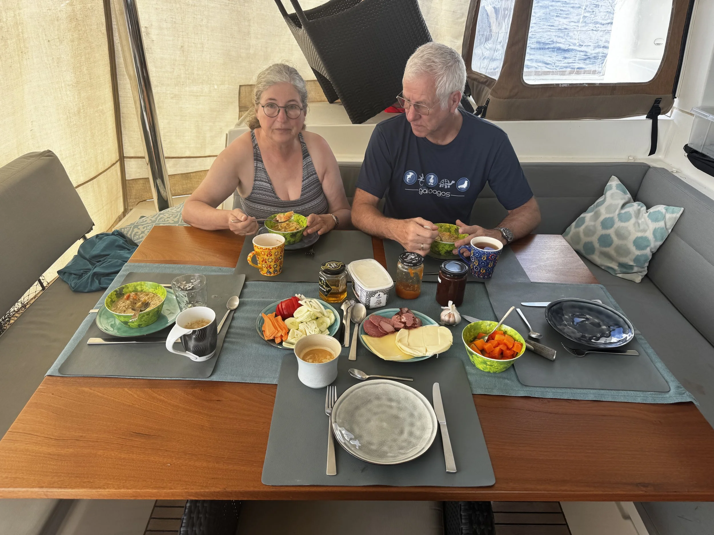 Der Tag beginnt mit einem guten Frühstück. Ralf und Lis haben ausreichend Getreide für ihr Spezialmüsli mitgebracht, das am Abend vorher bereits angesetzt wird. Dazu gibt Kaffee, Tee, getostetes Brot , Marmelade, Wurst, Käse, Tomaten, Karotten, Kraut (gut gegen Skorbut 😉). Man gönnt sich ja sonst nichts 😎.