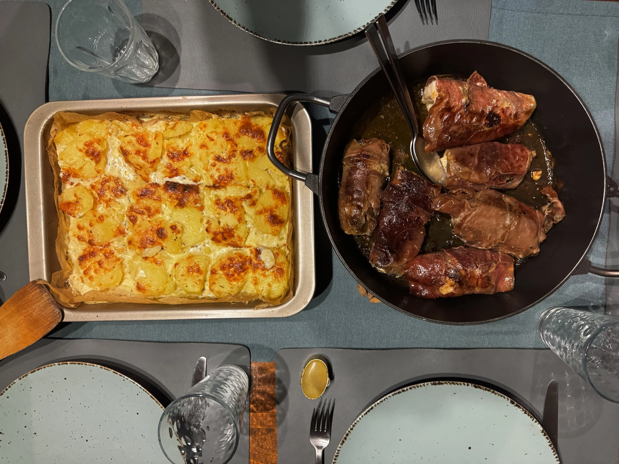 Zum Abendessen gab es Goldmakrele im Speckmantel mit Kartoffelgratin. Lecker.