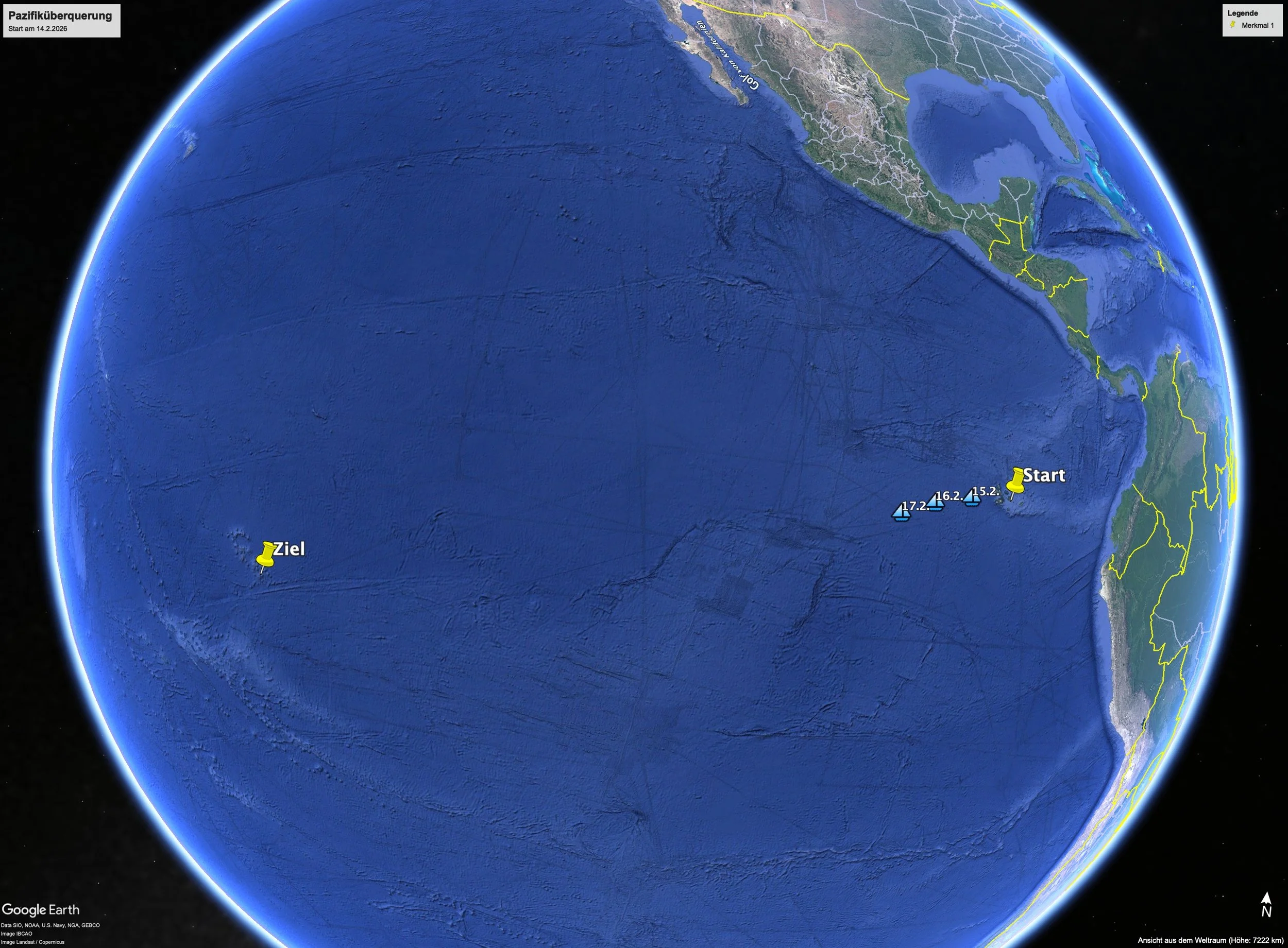 Startposition 16.02.26, 18:25 Uhr: 2°5′18″ S 95°44′4″ W