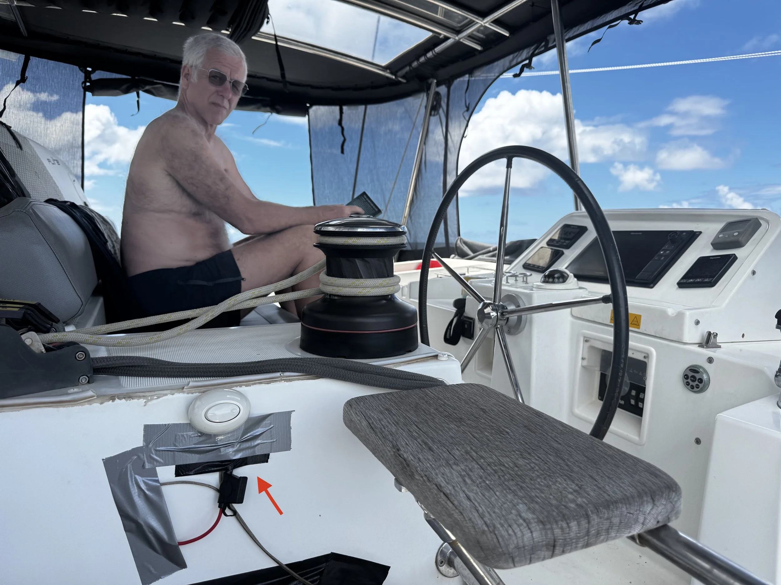 Felix hat den Ärger mit dem Kartenplotter dadurch etwas verringert, dass er ein Kabel vom Stromkasten samt Schalter zum Steuerstand verlegt hat, mit dem wir den Kartenplotter und den Autopiloten von dort aus neu starten können. Das erspart uns viel Herumkletterei an Bord. Lästig ist es aber trotzdem.