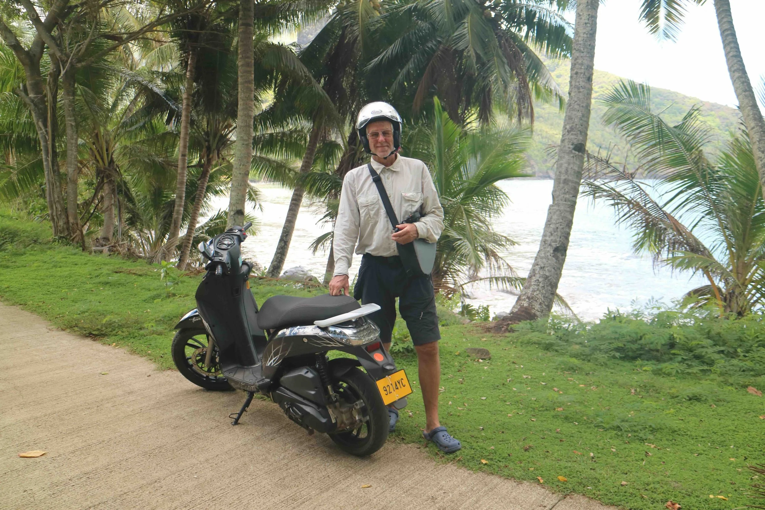Da Ralf und Lis noch an diesem Tag mit ihrem Roller die Insel weiter erkunden wollten, versuchte ich über Vorschlag von Ralf mir auch einen zu organisieren. Unsere Autovermieterin, die auch Roller vermietete, hatte aber keinen mehr. Felix hatte im Internet noch eine weitere Adresse gefunden, die wir aufsuchten. Im Garten vor einem in der zweiten Reihe stehenden Haus stand ein ansprechender Roller. Auf dem Tisch vor dem Haus unter einer Überdachung waren Unterlagen für die Vermietung von Rollern zu entdecken. Das Haus war aber leer. Keine Reaktion auf Rufen oder Klopfen. Also blieb uns nichts weiteres übrig als wieder unverrichteter Dinge abzurücken.