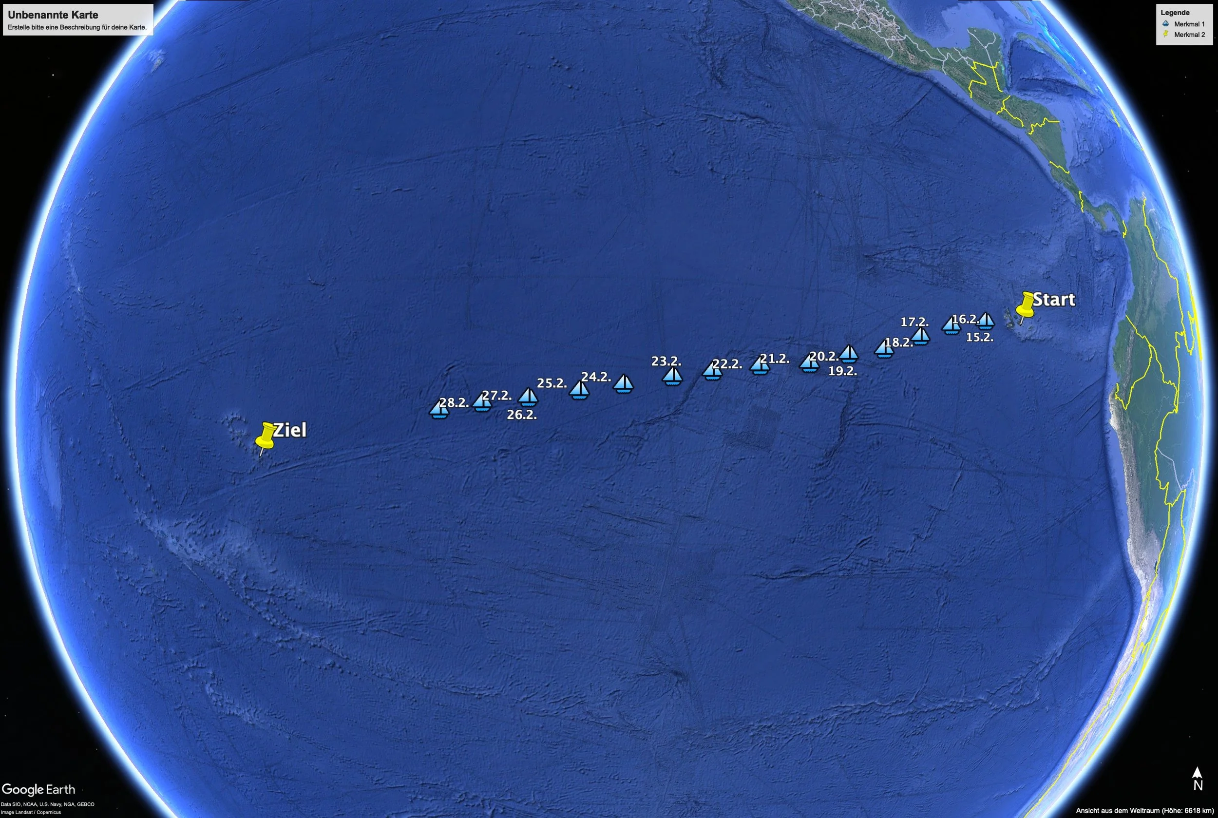 Startposition 27.2.26, 20:00 Uhr :7°32′55″ S 121°18′20″ W