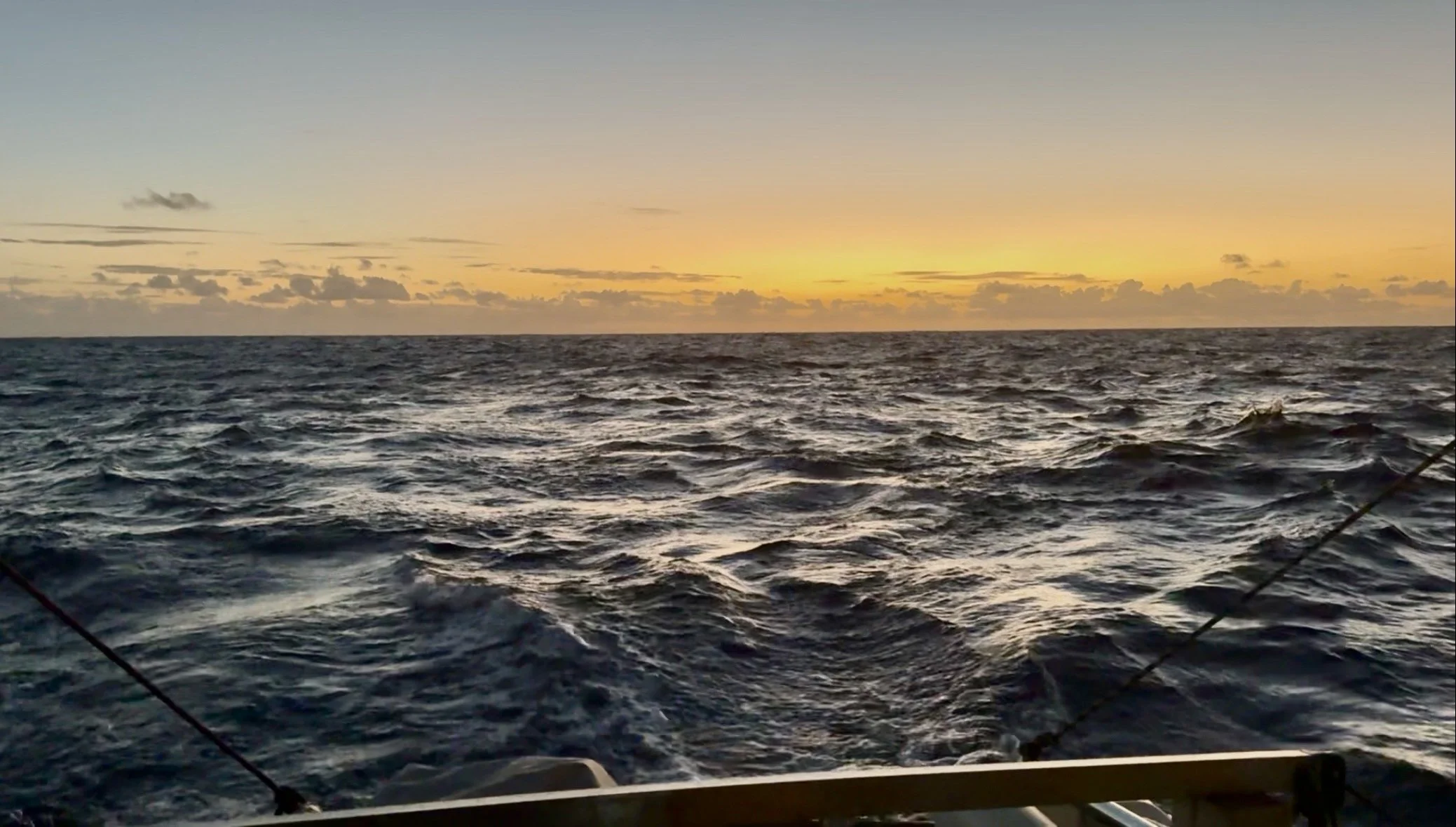 Der neue Tag kündigte den beginnenden Sonnenaufgang am Ende meiner Nachtwache (03:00 bis 06:00 Uhr) mit einem orange-goldenen Streifen an, der das dunkle Blau des Meeres vom immer heller werdenden Blau des Himmels trennte.