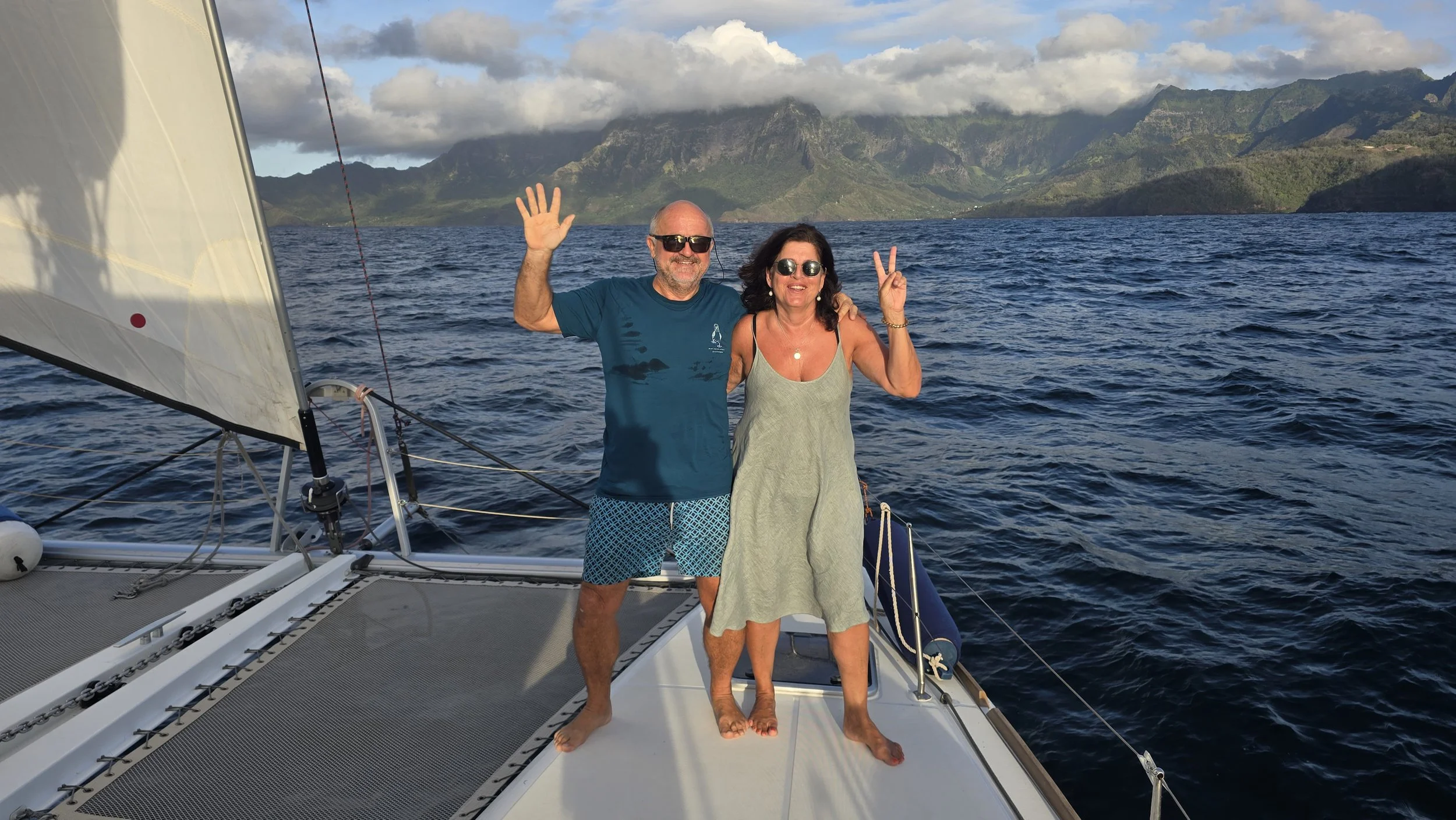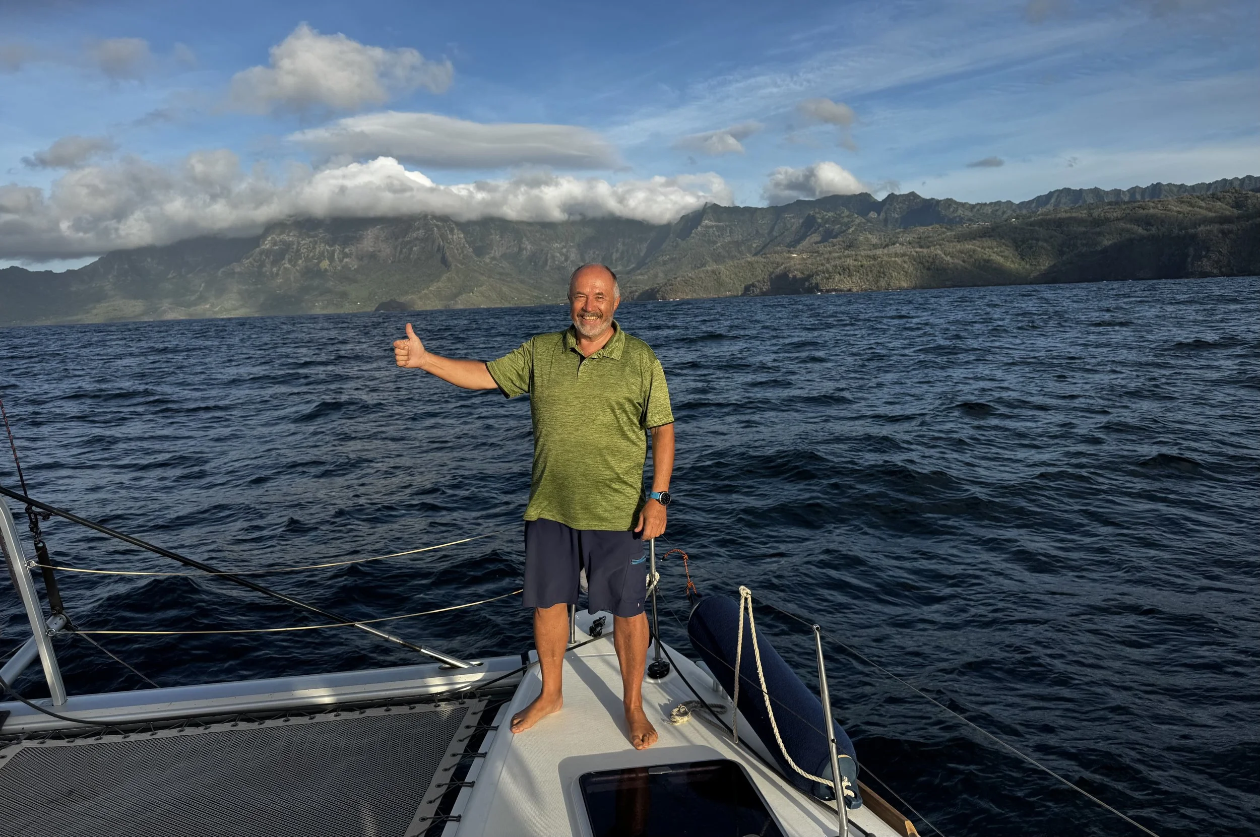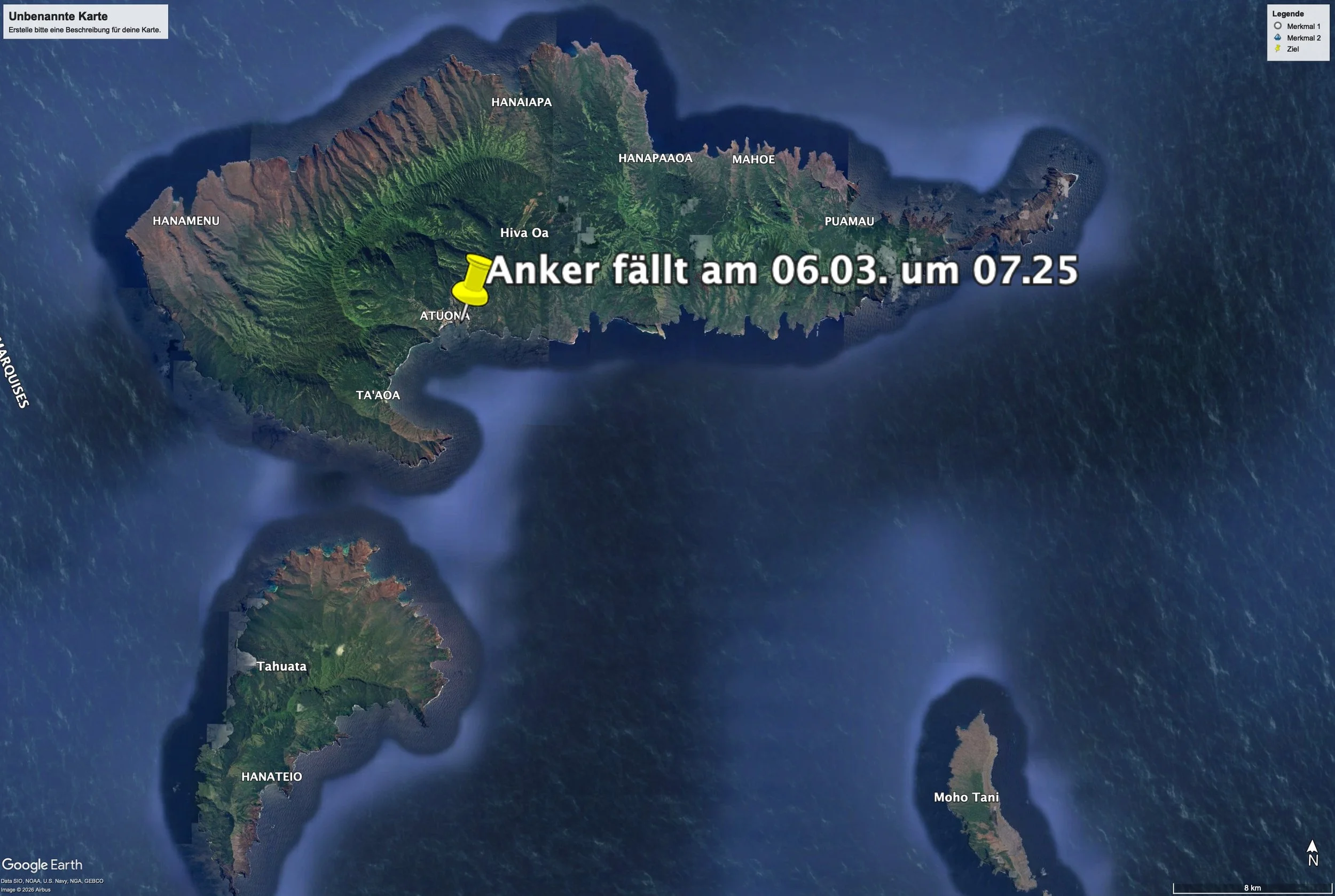 Der Anker fällt um 07.25 Ortszeit. Zu diesem Zeitpunkt sind alle Crewitglieder an Deck. Glückwünsche, fröhliche Ausgelassenheit, Fotozeit. Wir haben es geschafft. 19 Tage und 18 Stunden dauerte die Überfahrt von den Galapagosinseln zu den Marquesas. Eine schöne Zeit, eine gute Zeit. Gottes Segen war spürbar, sowohl was das Wetter, das Miteinander als auch das Segeln betraf.