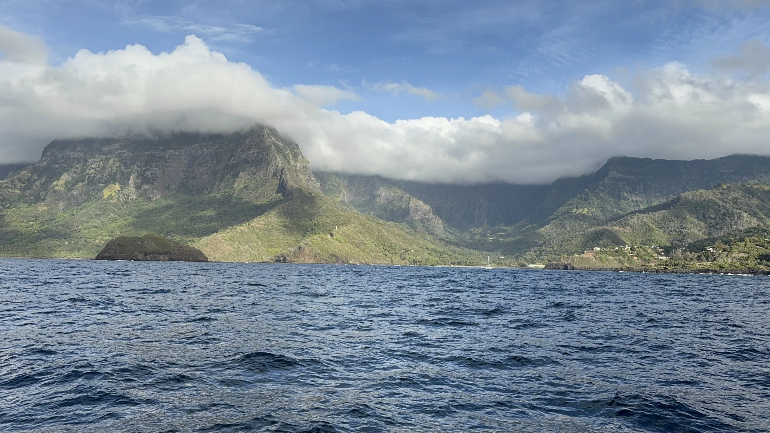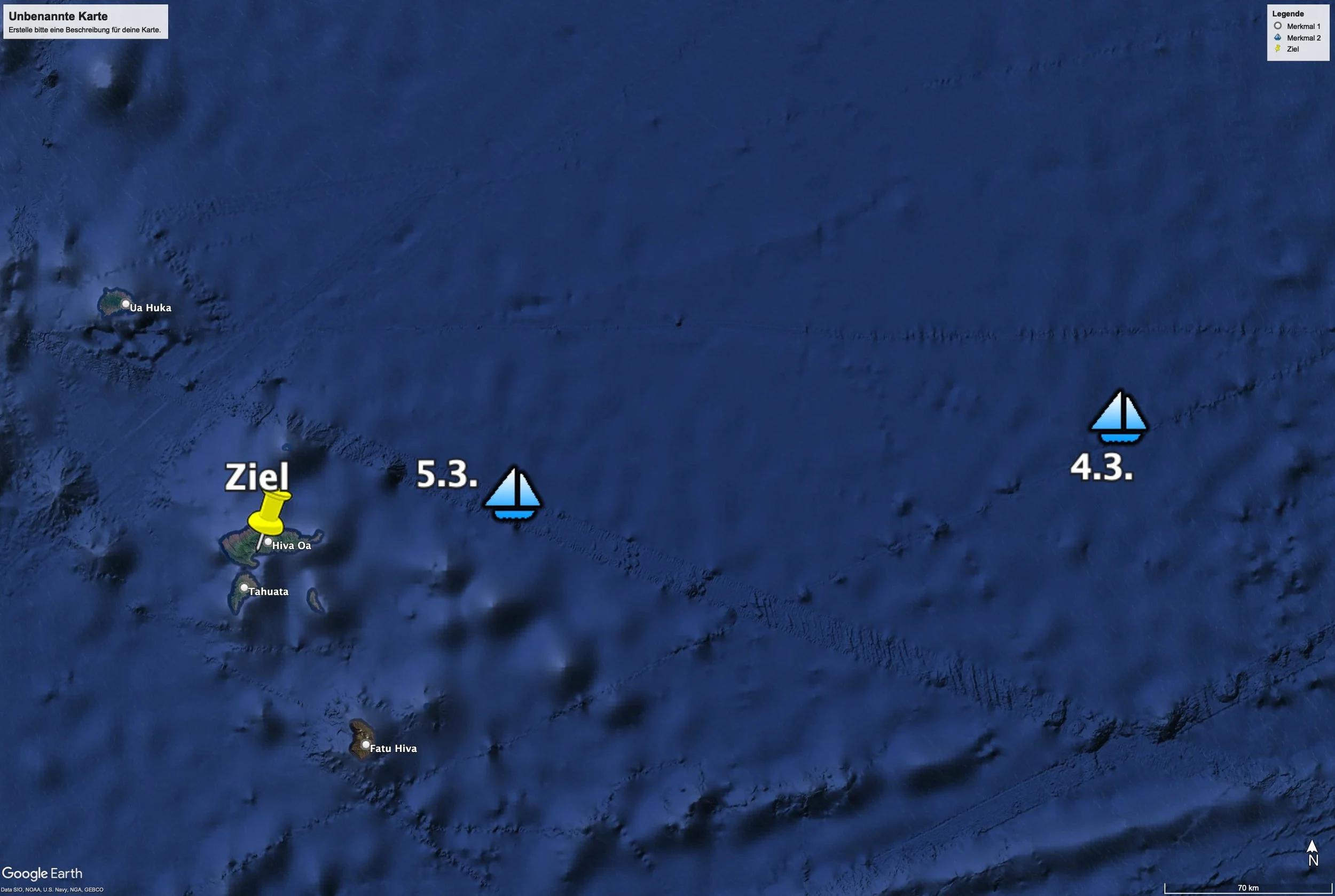 Ich hatte in dieser Nacht die Wache von 03:00 bis 06:00 Uhr. Als ich Ralf ablöste, konnte ich die Insel Hiva Oa schemenhaft wahrnehmen. Ralf der auf die Instrumente und sein Buch sah, hatte sie noch nicht wahrgenommen und stieg auch von der Brücke um am Vorsegel vorbeisehen zu können.