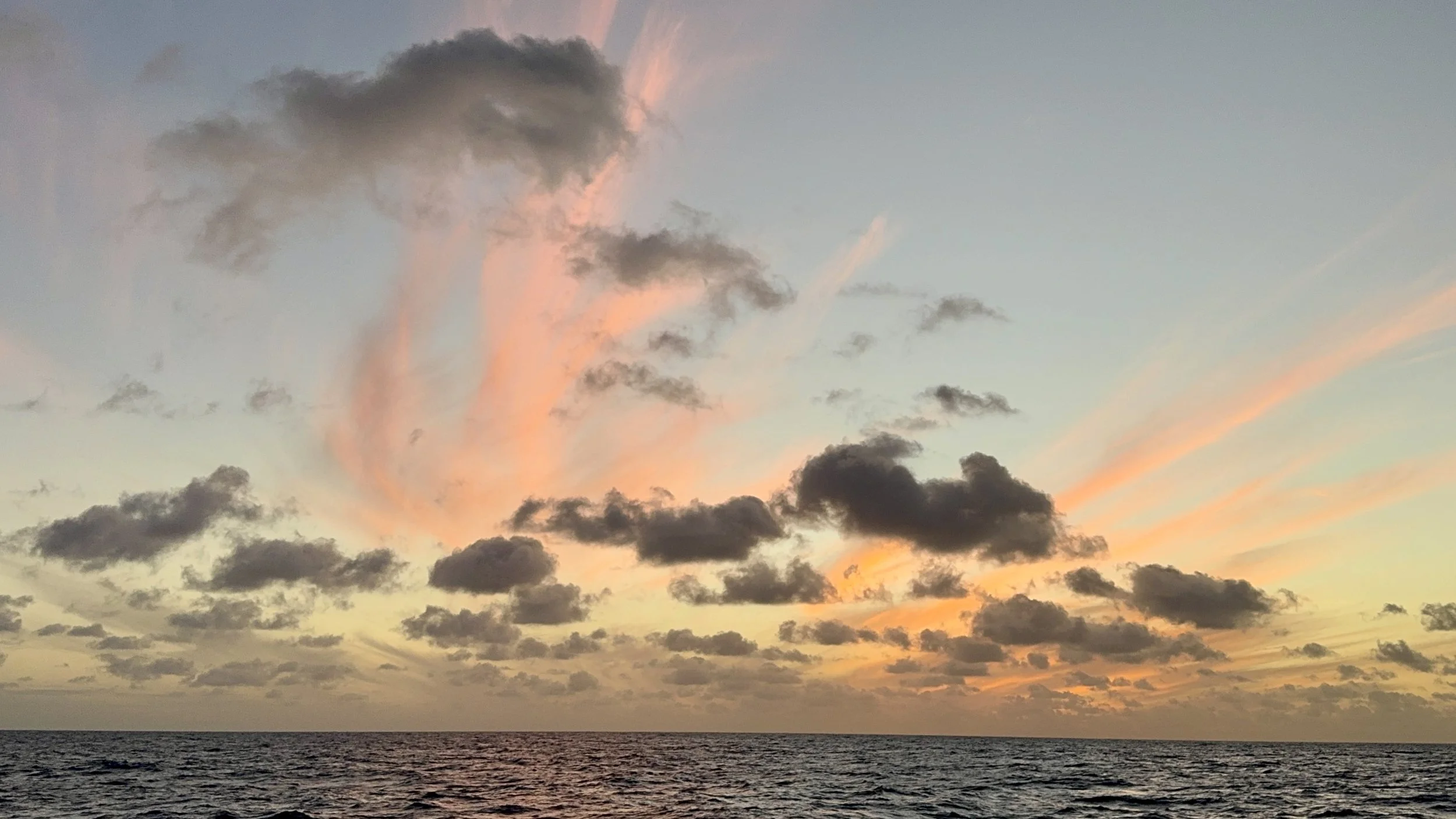 Der letzte volle Tag auf See schloss mit einem untypischen Sonnenuntergang. Die Sonne versteckte sich so hinter den Wolken, dass sie nicht mehr zu sehen war. Dafür beleuchtete sie Zirren, die wir bis dahin auch noch nicht in dieser Form gesehen hatten.