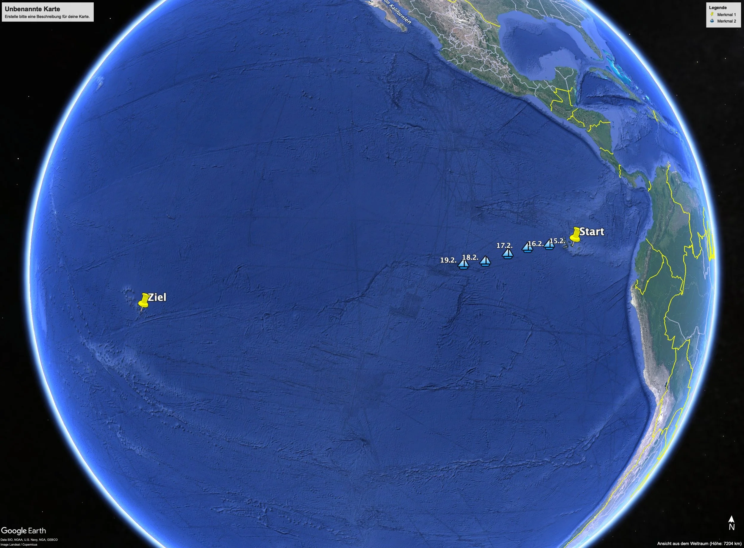 Endposition 19.02.26, 20:20 Uhr: 4°21′22″ S 102°41′9″ W