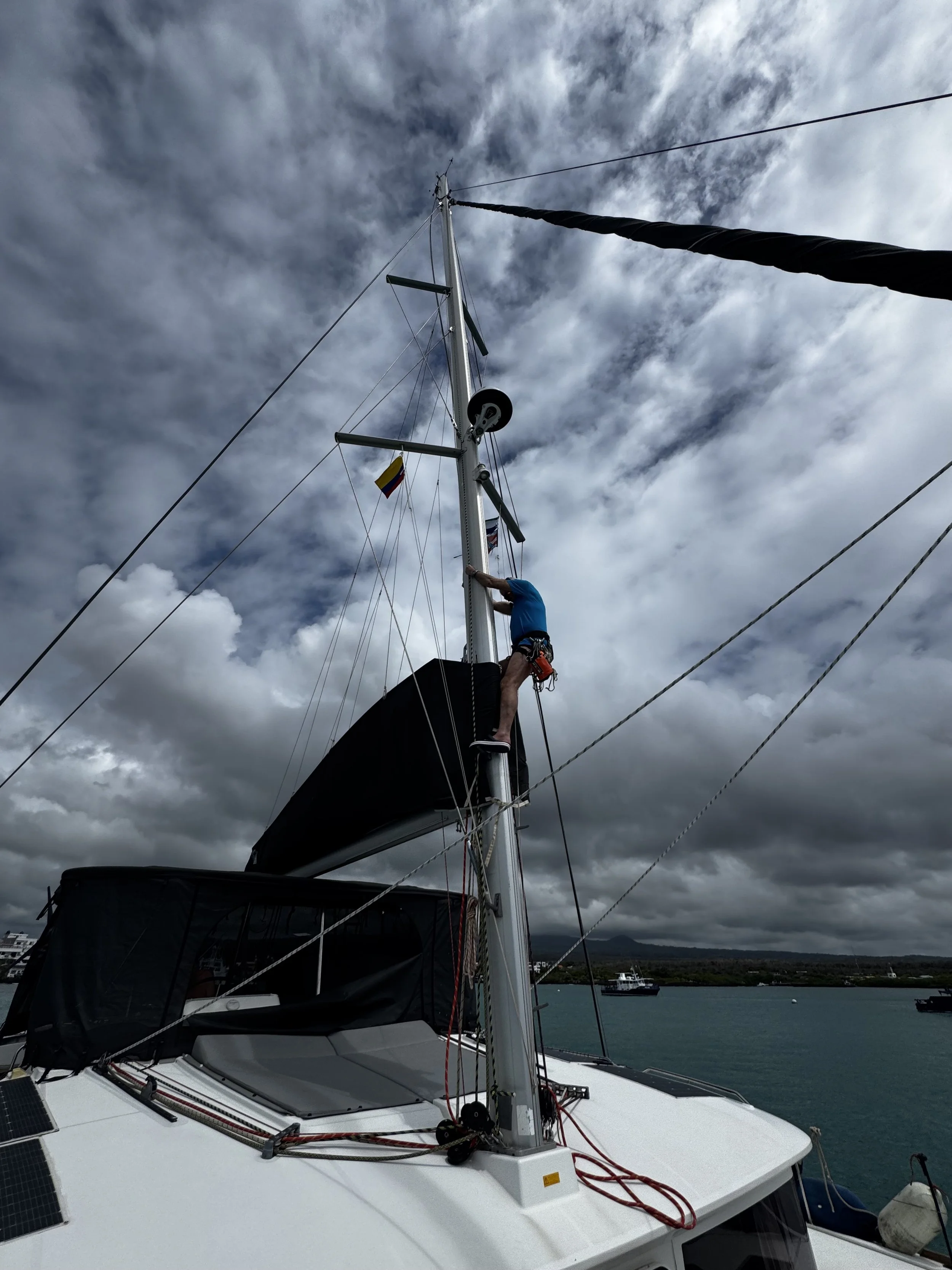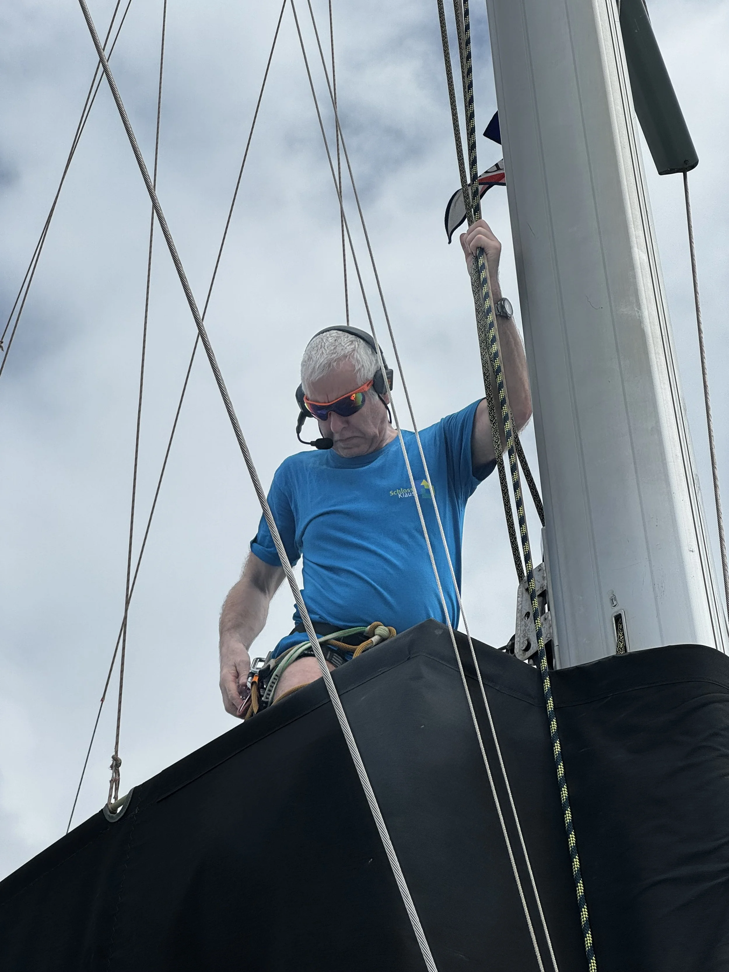 Bei der Frage, wem die Aufgabe zur Bewältigung der 23 Höhenmeter bis zur Mastspitze übertragen werden wird, fiel die Wahl auf Grund der diesbezüglichen Qualitfikation als Berg- und Höhlenretter relativ schnell auf Ralf. Er machte sich nach akribischer Vorbereitung auf den Aufstieg, der unterstützt durch Gerhard und Reinhard sowie der Elektrowinsch durchgeführt wurde. Nach insgesamt zweieinhalb Stunden Arbeit war das Problem dann gelöst und die Dirk konnte wieder am Ende des Großbaumes befestigt werden.