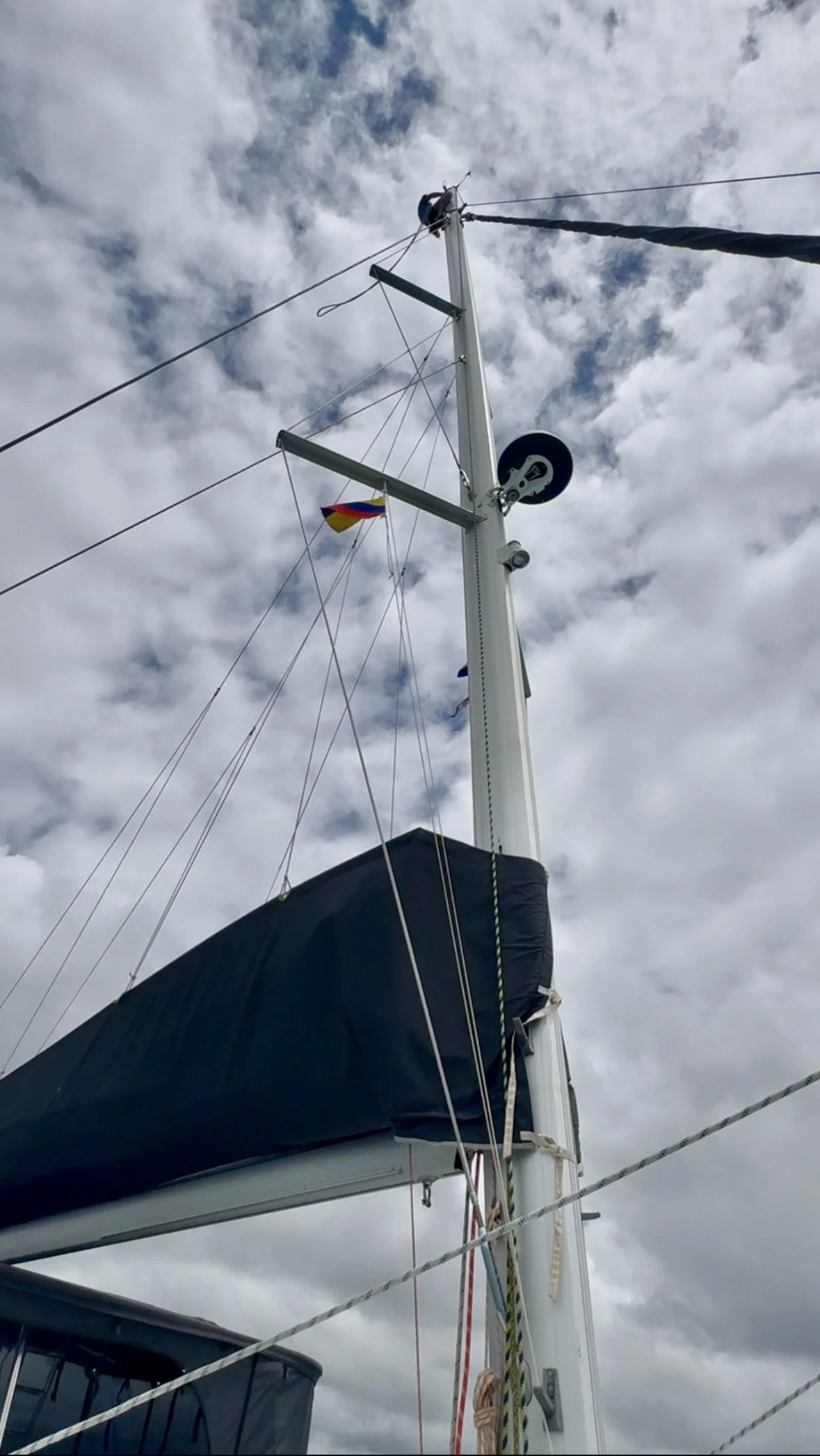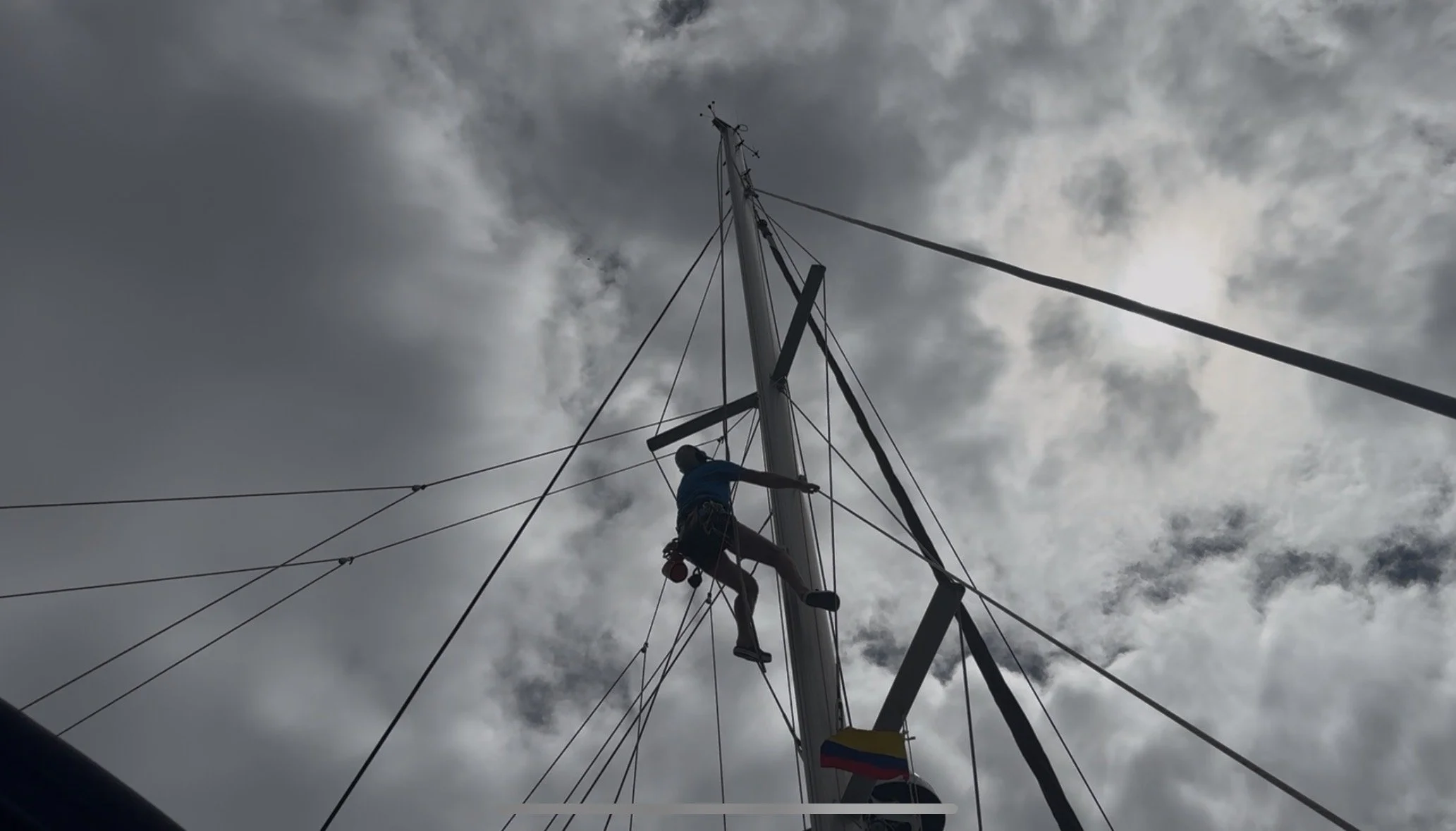 Die Dirk (Leine, die speziell dafür konzipiert ist, den Baum, also den horizontalen Mast, zu stützen und zu positionieren. Sie erstreckt sich vom Masttop, dem höchsten Punkt des Mastes, bis zur Baumnock, dem äußersten Ende des Baums.) hatte sich gelöst und hatte sich im oberen Bereich des Mastes verwickelt.