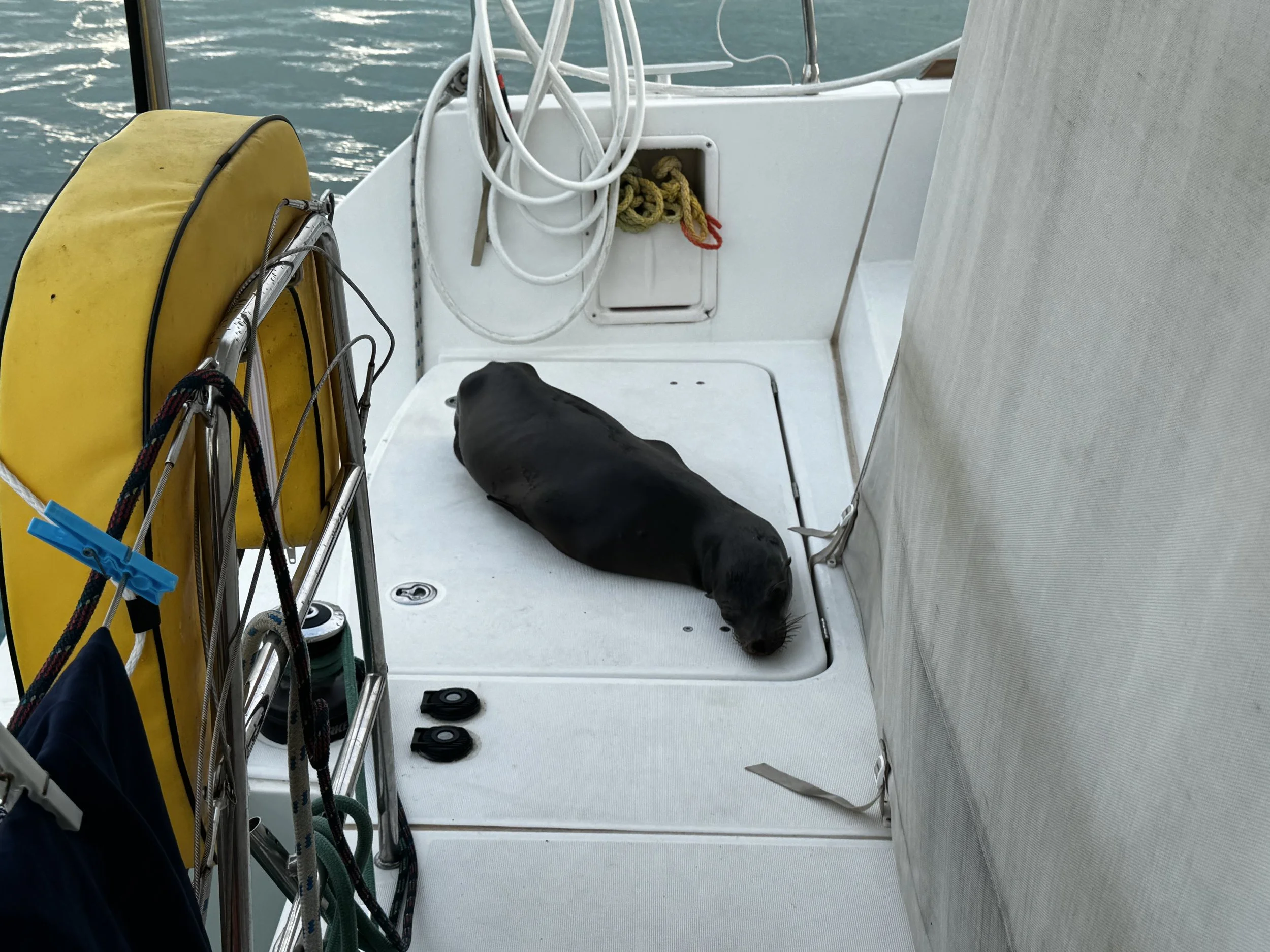 Bei einem Blick auf das Heck des Bootes präsentierte sich ein stattlicher Seehund, der es geschafft hatte sich aus dem Wasser über die drei Stufen auf den Bereich vor der Kabine zu platzieren und es sich dort gemütlich zu machen. Bei Annäherung öffnet er das eine oder andere Auge, manchmal hob er auch den Kopf um uns genauer in Augenschein zu nehmen. Anstalten sich von seinem eingenommen Platz zu entfernen machte er nicht. Als er dann begann uns seine funktionierende Verdauung zu demonstrieren, verminderte sich die zuvor vorhandene Sympathie doch etwas. Nach einiger Zeit wurde der Wasserschlauch in Funktion gesetzt, was ihn letztendlich doch bewog sich wieder in Wasser zu verfügen.